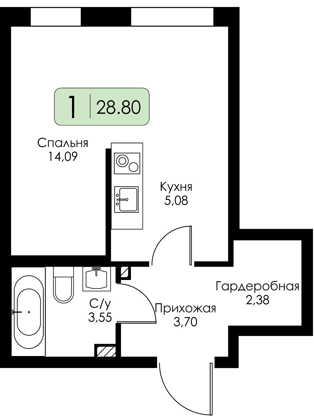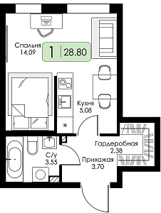 Квартира-студия №36 с предчистовой отделкой, Корпус № 1.1, Секция 2