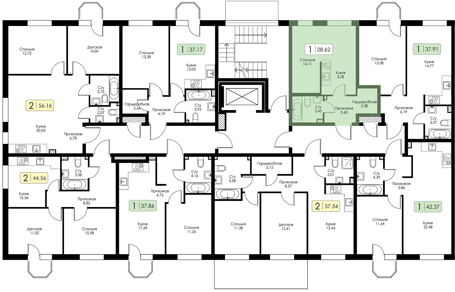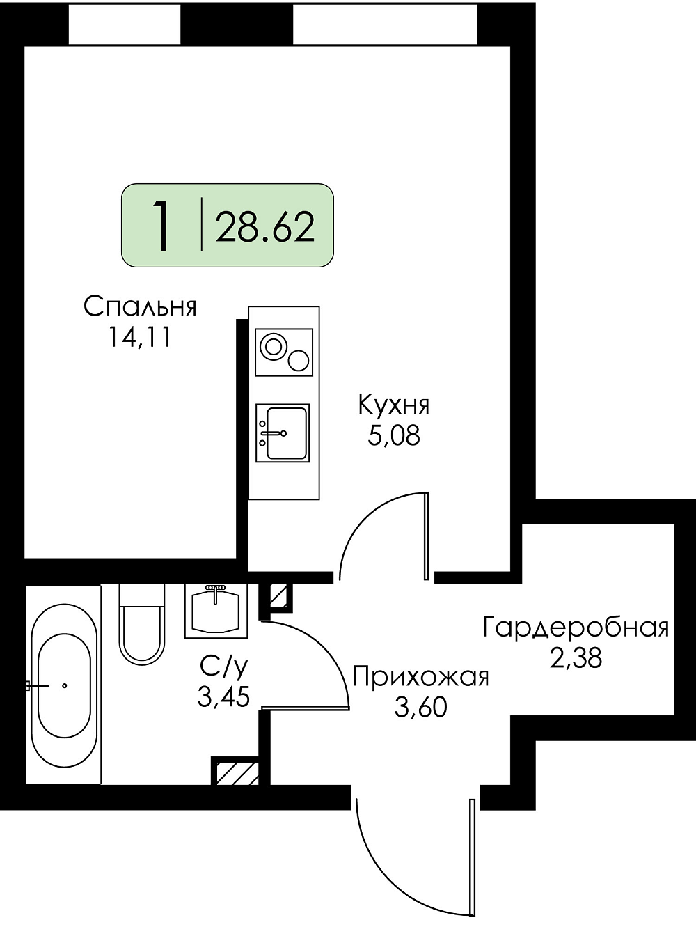 Квартира-студия №52 с предчистовой отделкой, Корпус № 1.1, Секция 2
