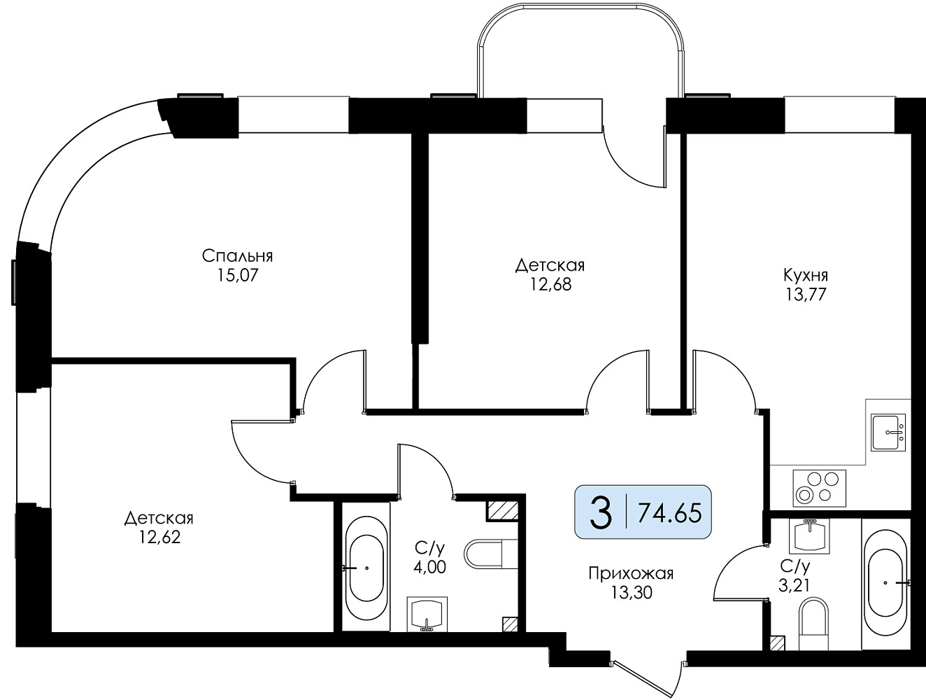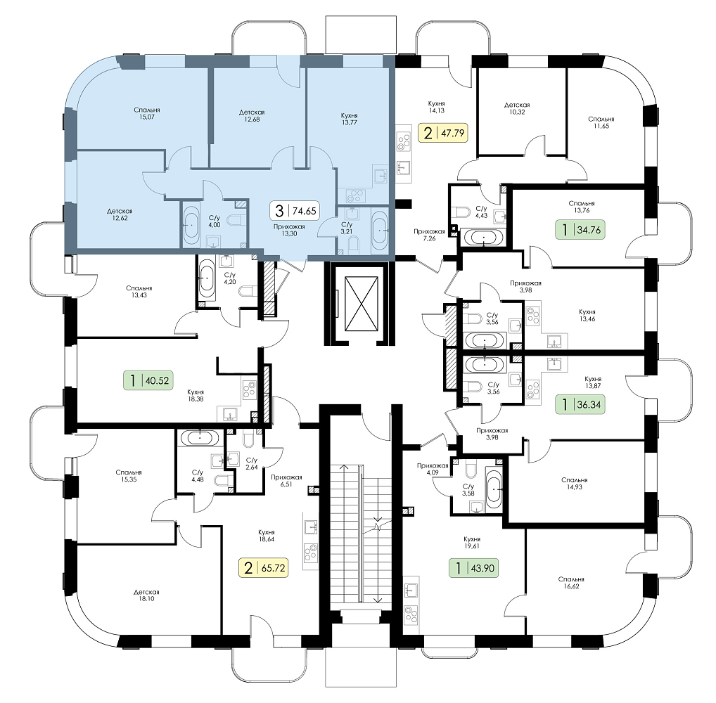 Трехкомнатная квартира №28 с предчистовой отделкой, Корпус № 1.1, Секция 1