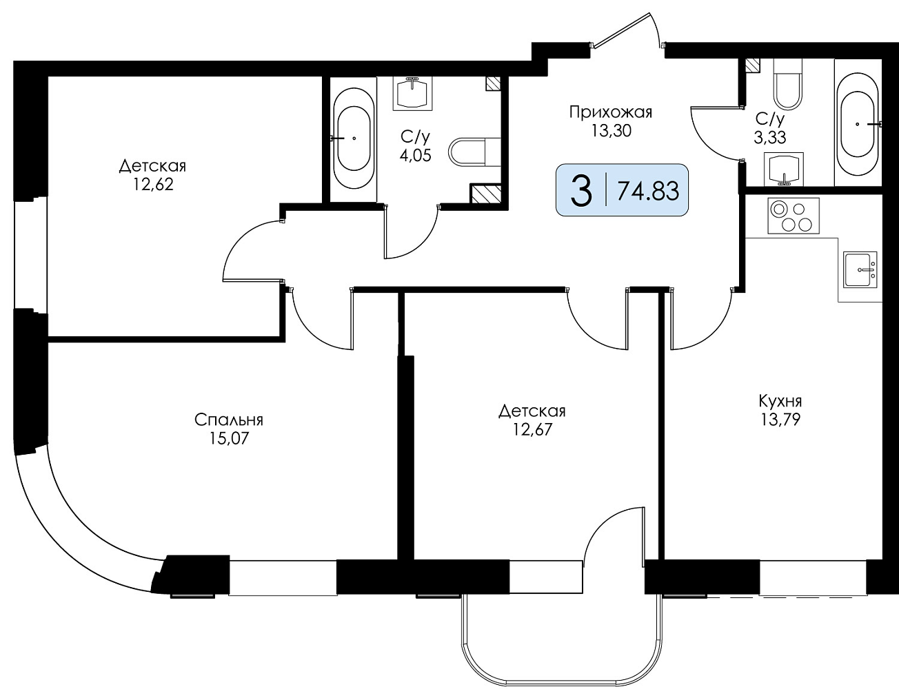 Трехкомнатная квартира №105 с предчистовой отделкой, Корпус № 1.1, Секция 4