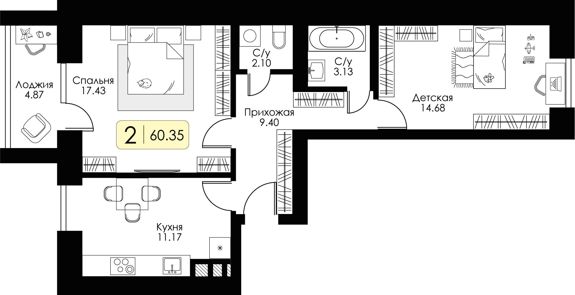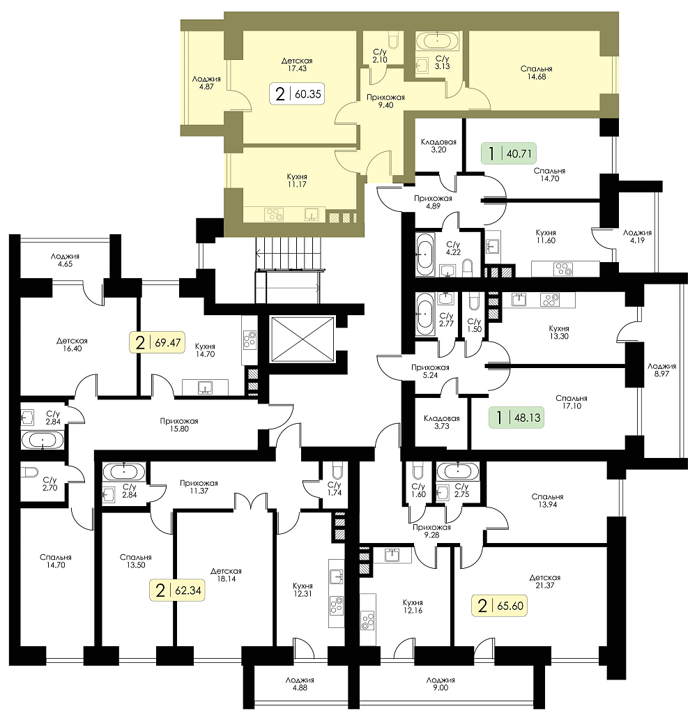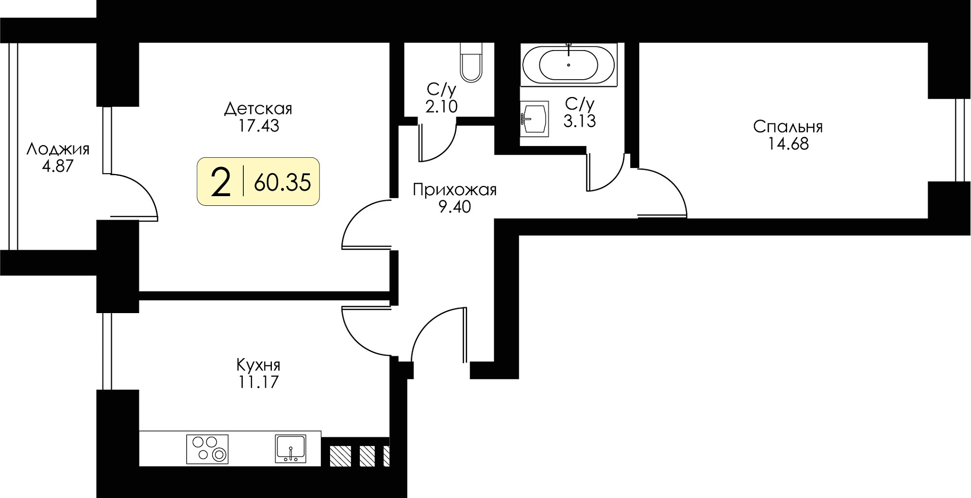 Двухкомнатная квартира №37 c черновой отделкой, Корпус дом №7, Секция 1