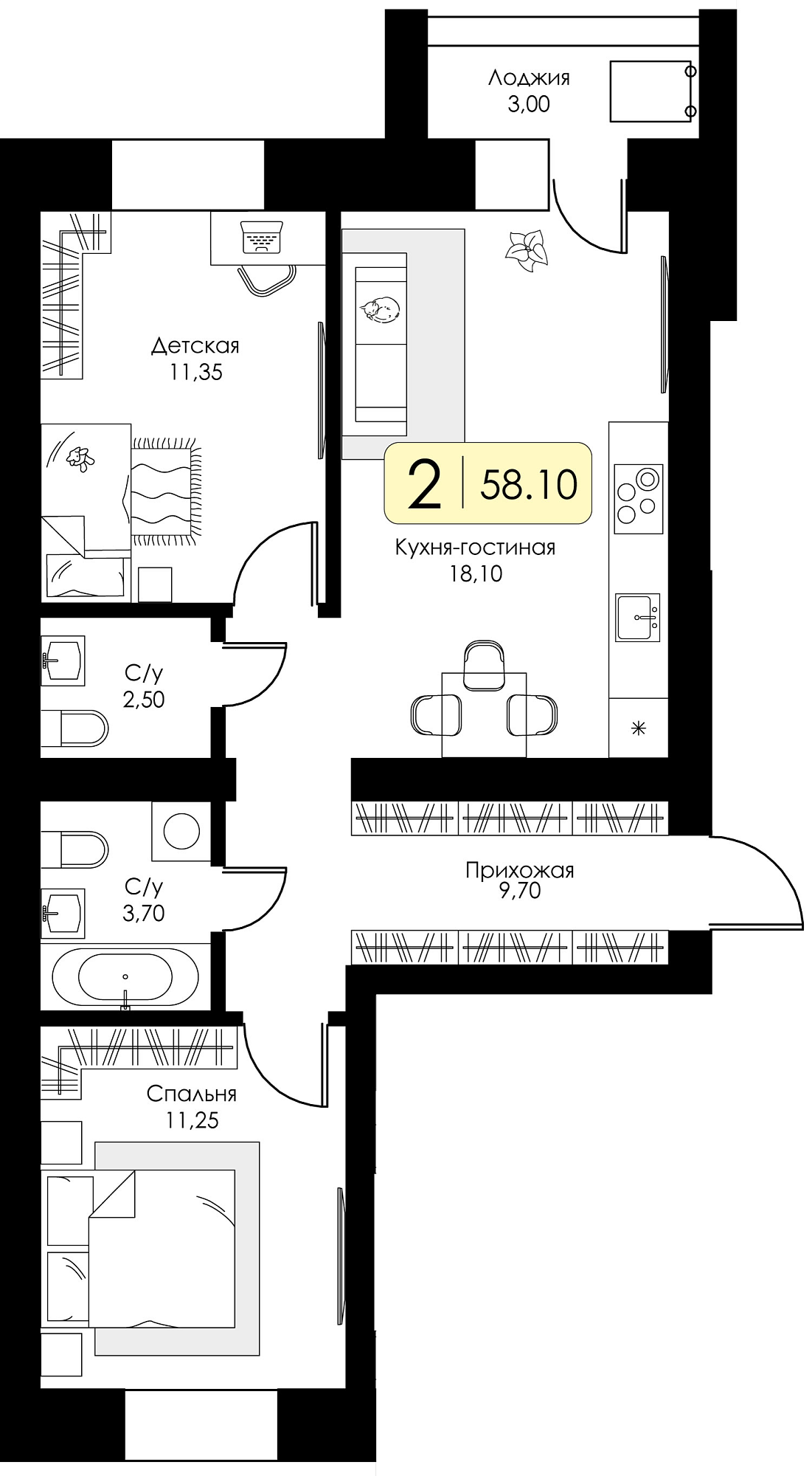 Двухкомнатная квартира №89 с чистовой отделкой, Корпус дом №10, Секция 2