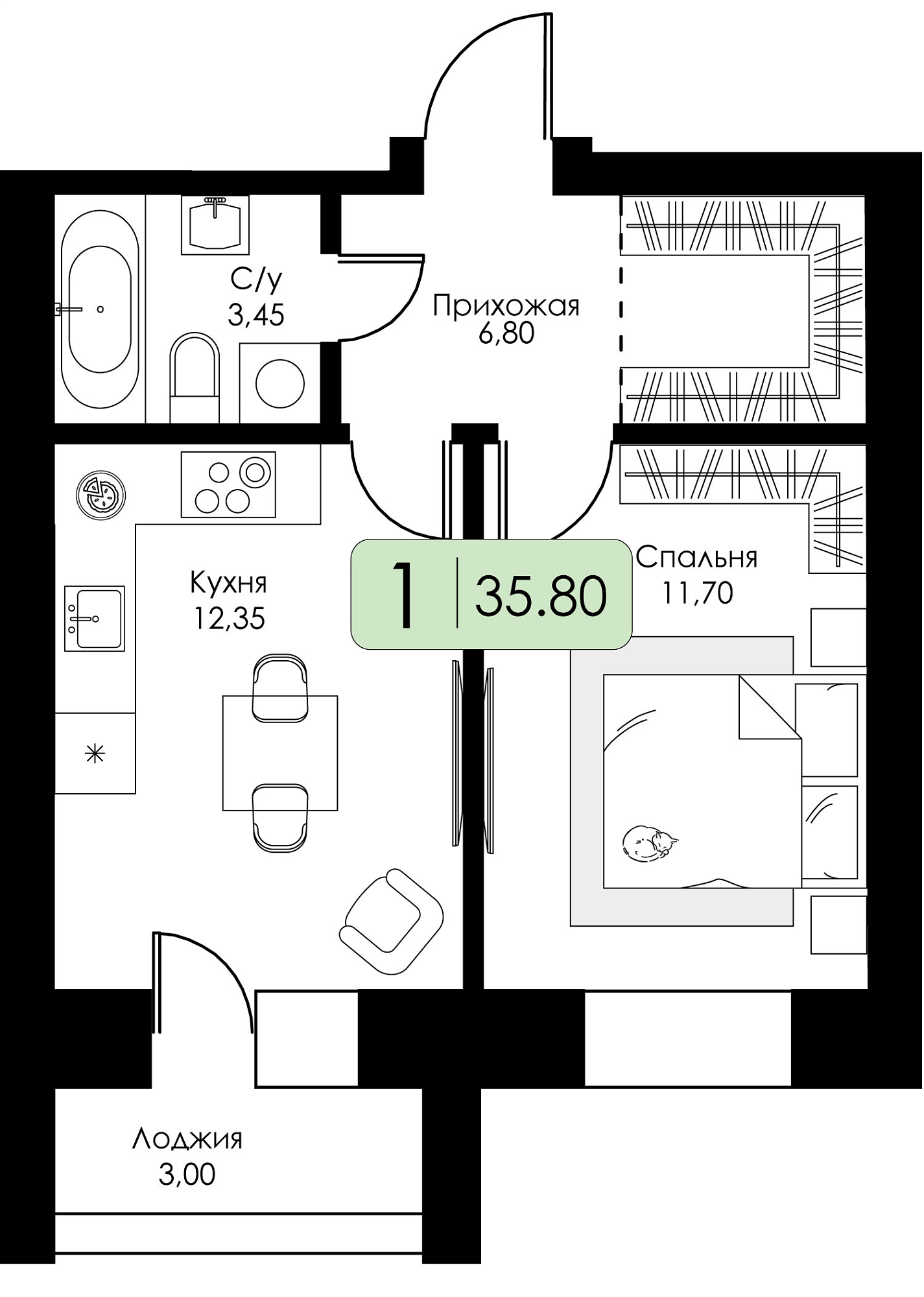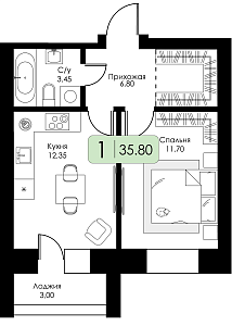 Однокомнатная квартира №12 с предчистовой отделкой, Корпус дом №10, Секция 1