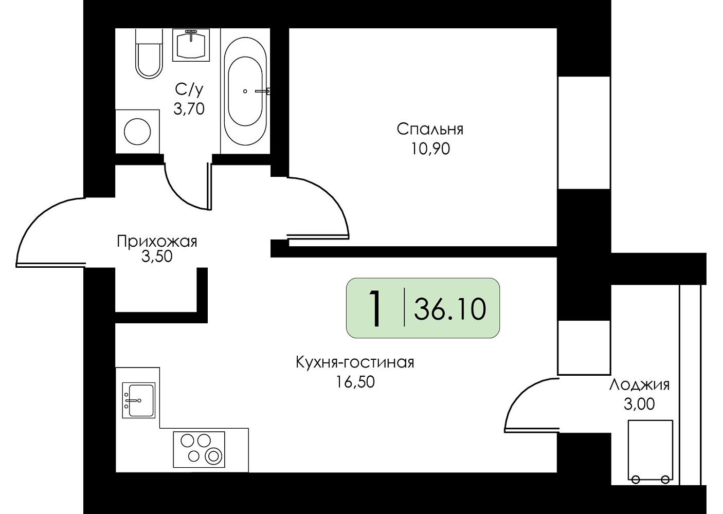 Однокомнатная квартира №116 с предчистовой отделкой, Корпус дом №10, Секция 2