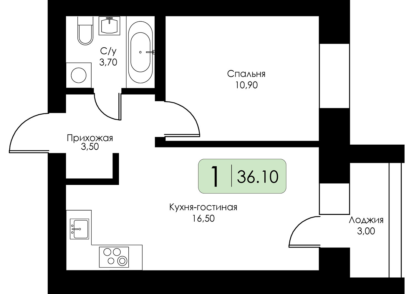 Однокомнатная квартира №60 с предчистовой отделкой, Корпус дом №10, Секция 2