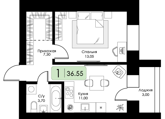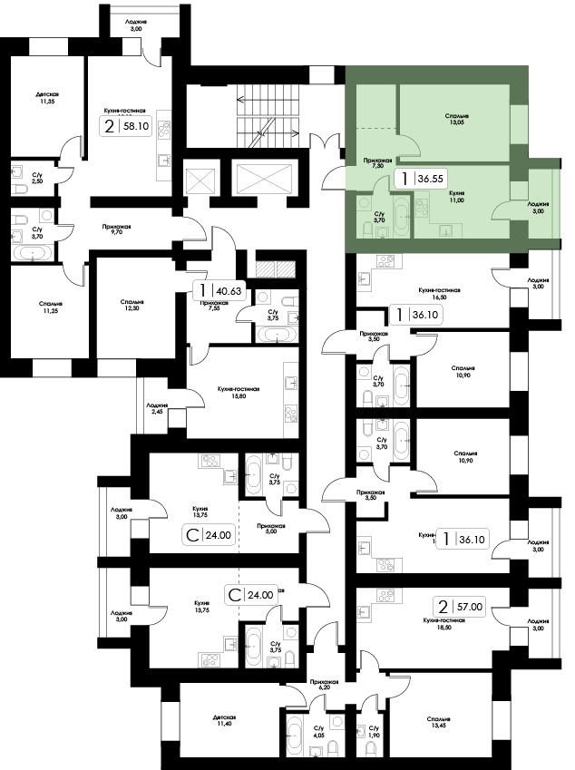 Однокомнатная квартира №114 с предчистовой отделкой, Корпус дом №10, Секция 2